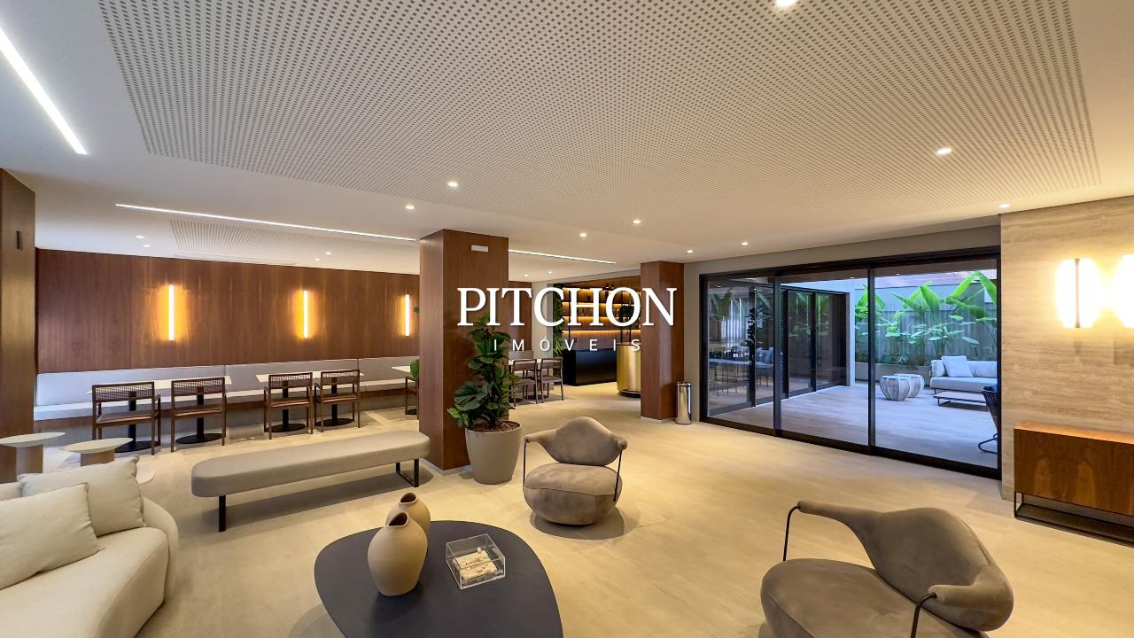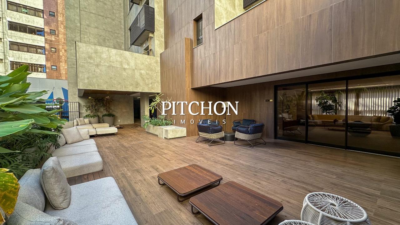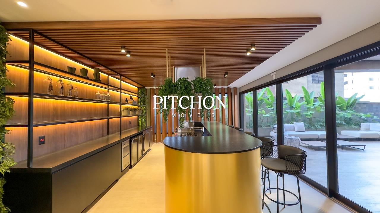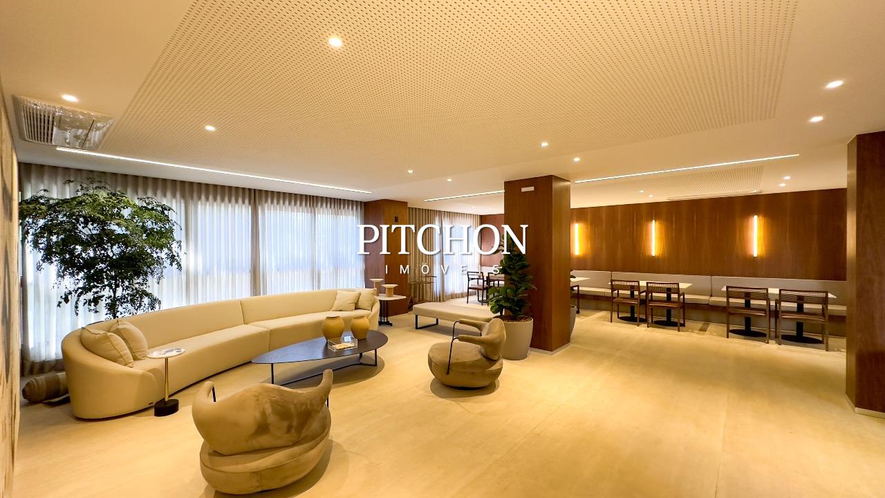 A área privativa possui 143,86 m², sendo 42,30 m² de área externa e 101,5 m² de área interna. O apartamento conta com três quartos, sendo uma suíte, lavabo, ampla sala para dois ambientes, cozinha integrada e banho de serviço. Os acabamentos são de alto padrão, com porcelanato nas áreas sociais e molhadas, e duas vagas de garagem livres.