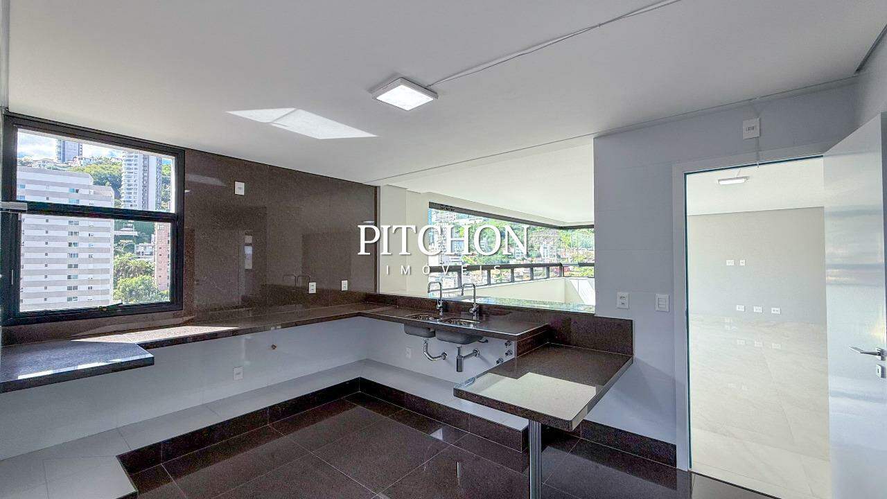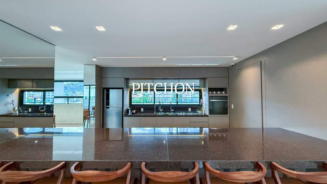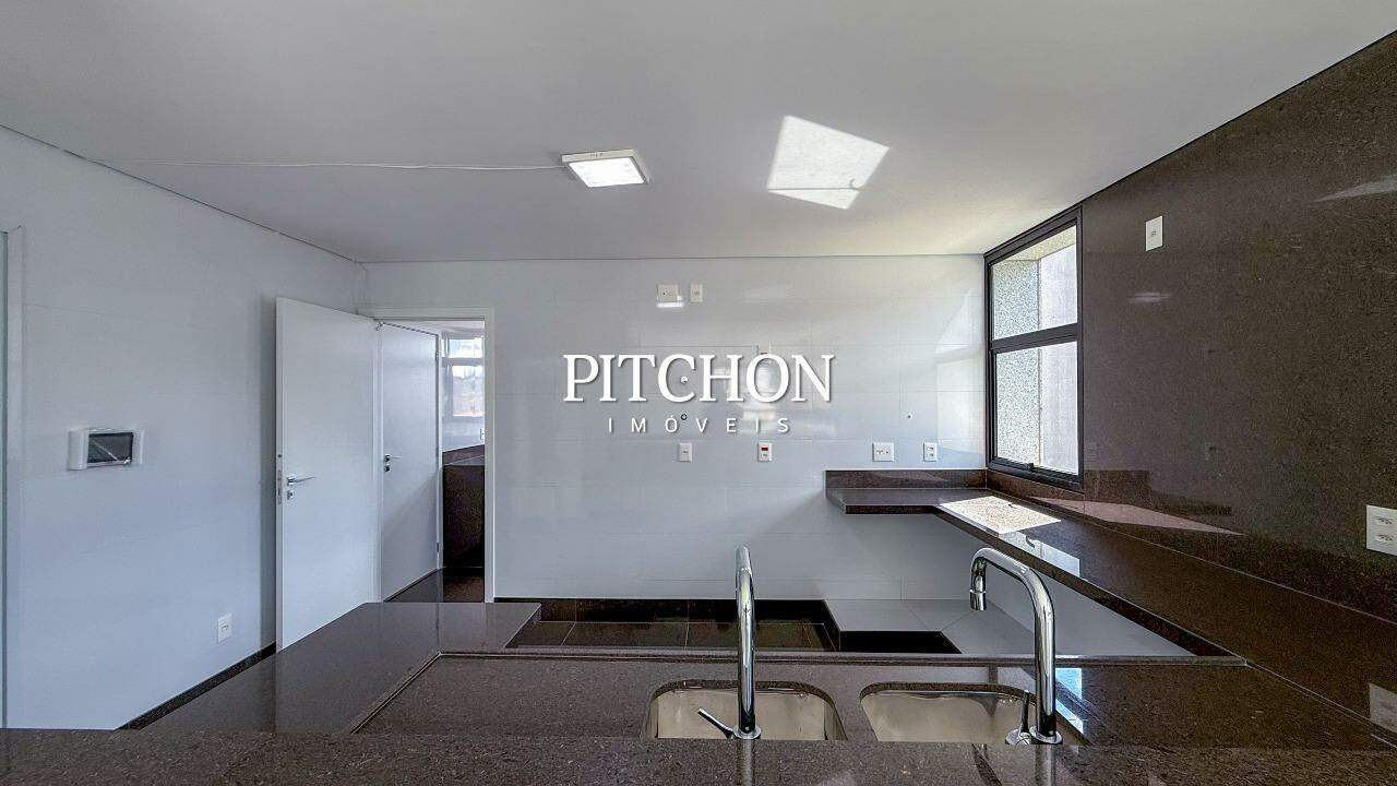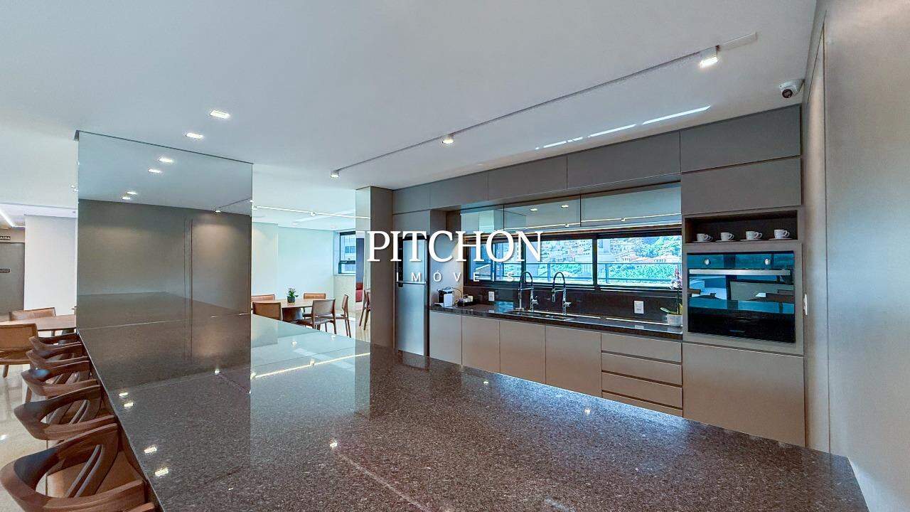 Cozinha moderna com piso e bancadas em granito, além de área de serviço independente, também com piso e bancada em granito, e dependência completa para funcionários.