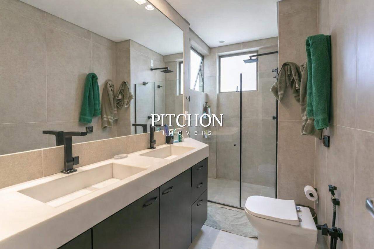 Banheiros (social e suíte) com box em blindex, armários e espelhos.