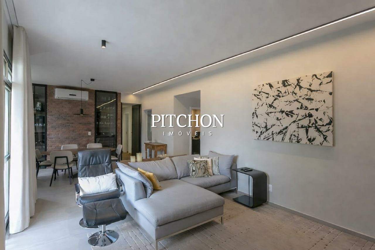 Sala para 02 ambientes, com piso em porcelanato, teto em gesso, projeto de iluminação da A de Arte, ar-condicionado, adega e varanda integrada.