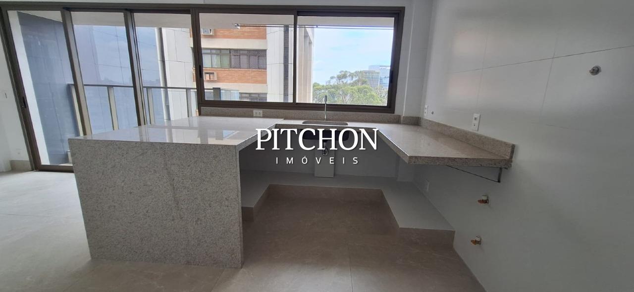 Cozinha tipo americana com ampla bancada, área de serviço.