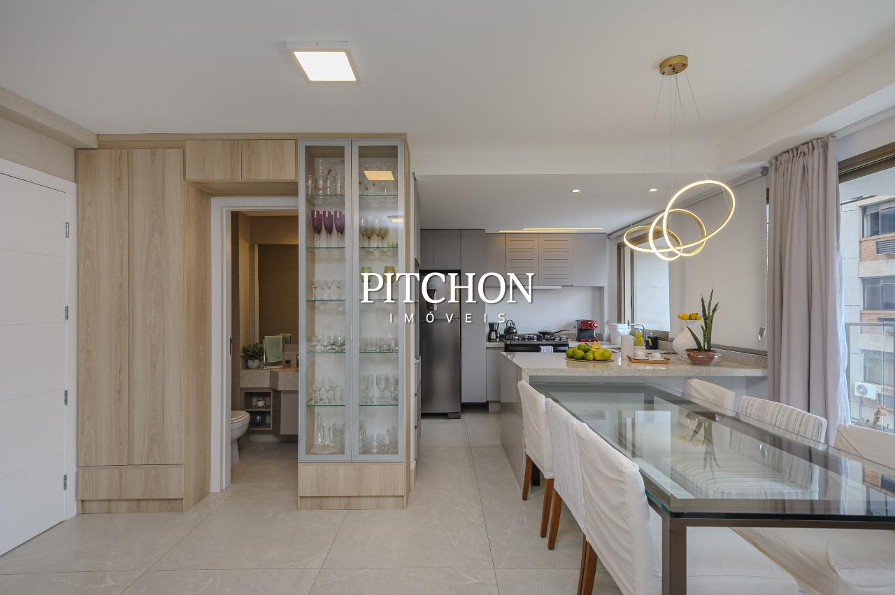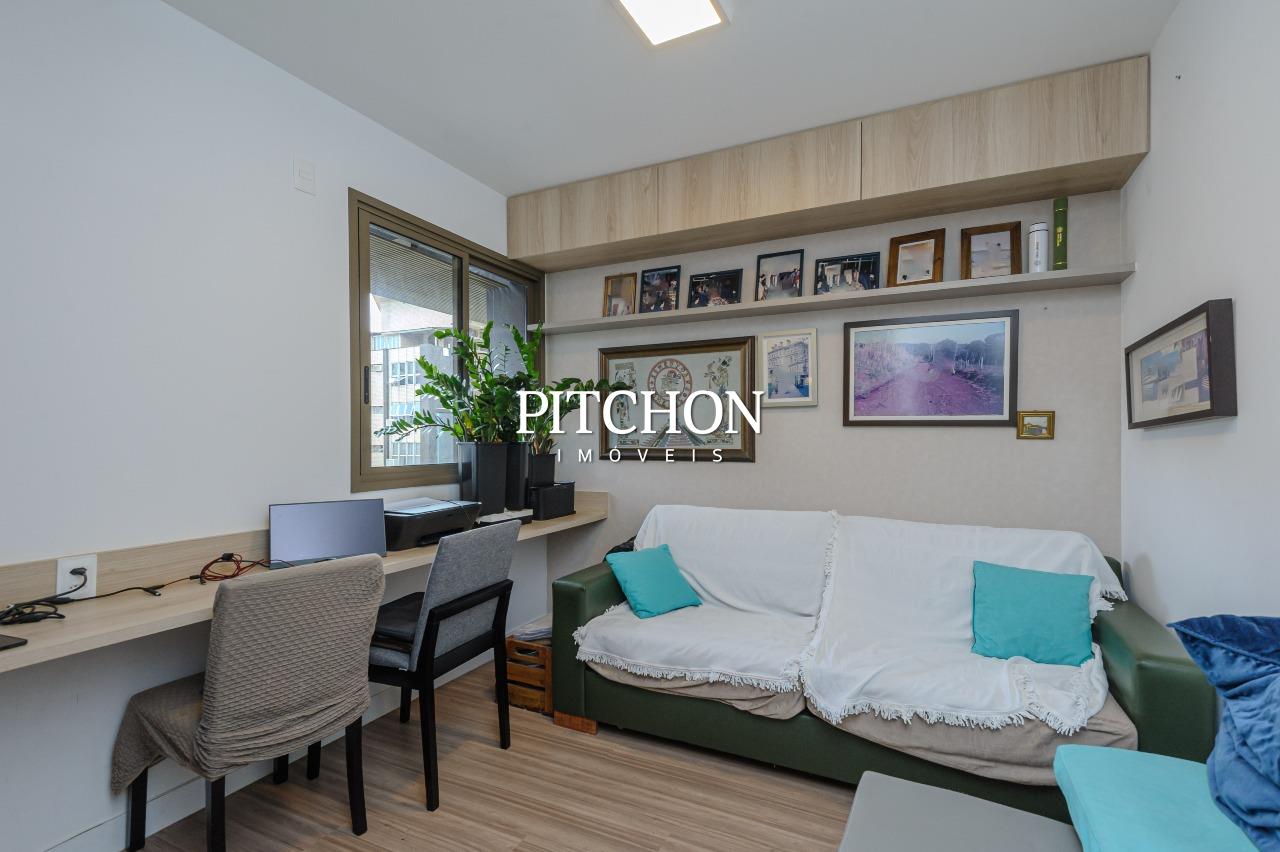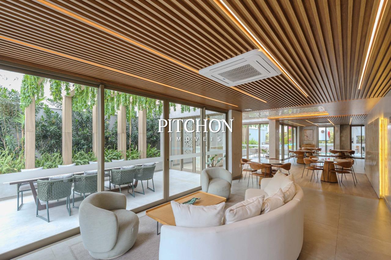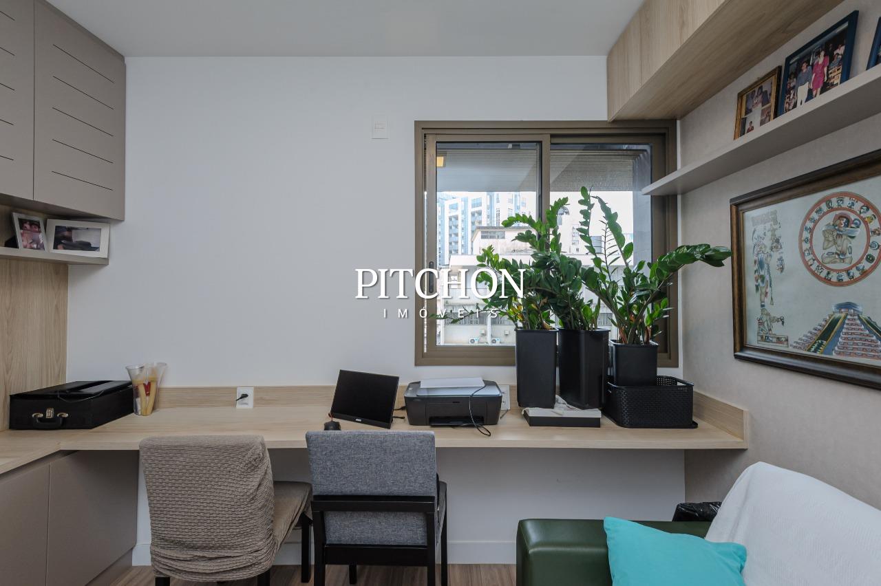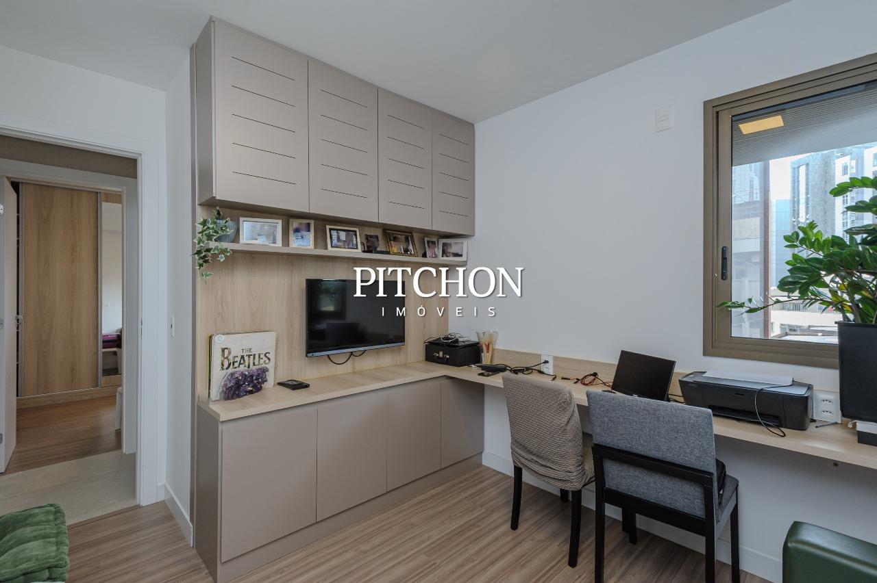 Sala ampla para dois ambientes com piso em porcelanato e quartos com piso em vinílico, varanda com vista livre e definitiva, área de serviço, lavabo, banheiro social, 3 quartos com armários, sendo duas suítes e um escritório, 2 vagas de garagem cobertas.