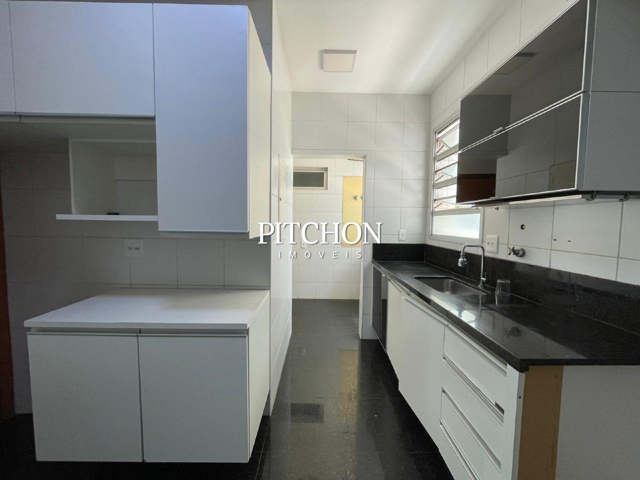 A cozinha é ampla e funcional, com piso em granito preto polido, armários planejados em acabamento branco e bancadas em granito, ideal para o dia a dia. O imóvel ainda dispõe de banheiro social, lavabo, dependência completa de empregada (DCE) e área de serviço com armários.