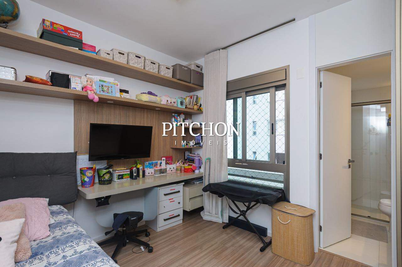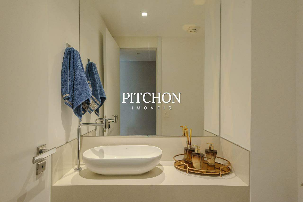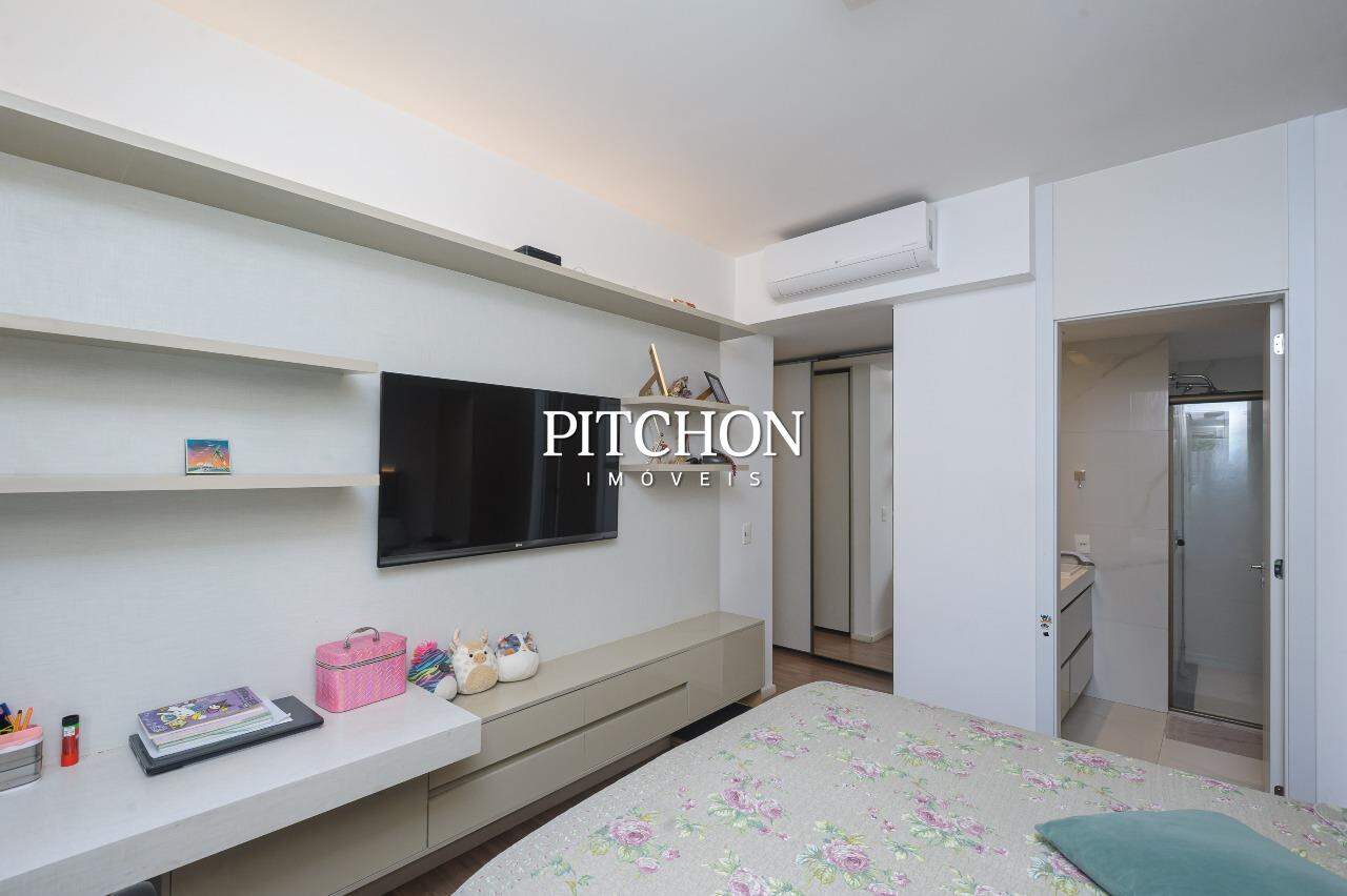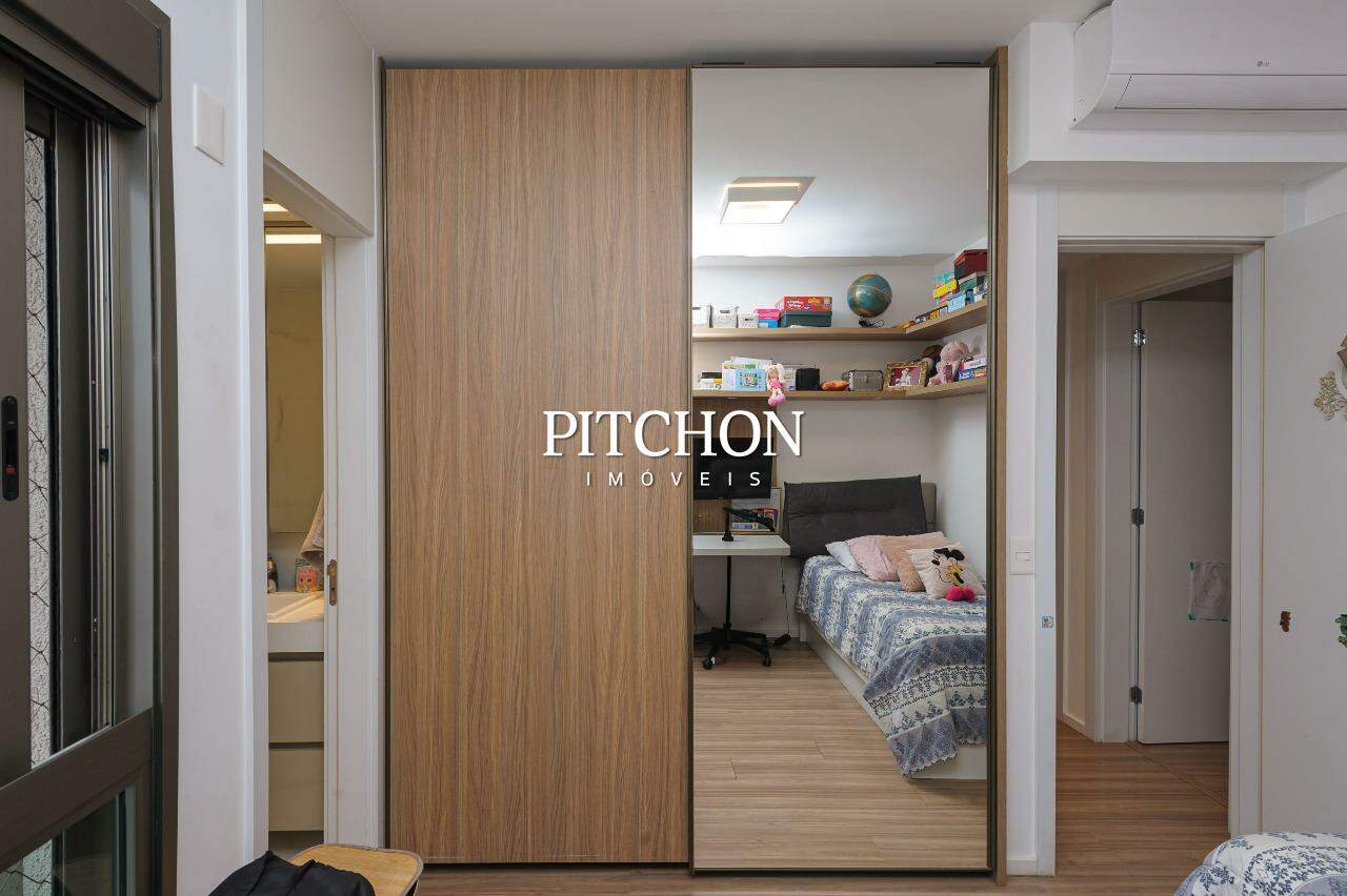 Área íntima com rouparia no corredor e 4 quartos, todos com armários planejados com portas de correr em espelhos e ar condicionado, sendo 2 suítes e 2 semi-suítes. O apartamento ainda conta com 3 vagas de garagem e box de garagem.