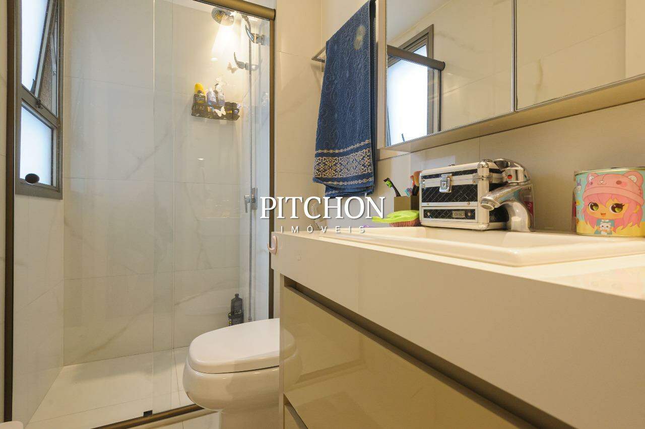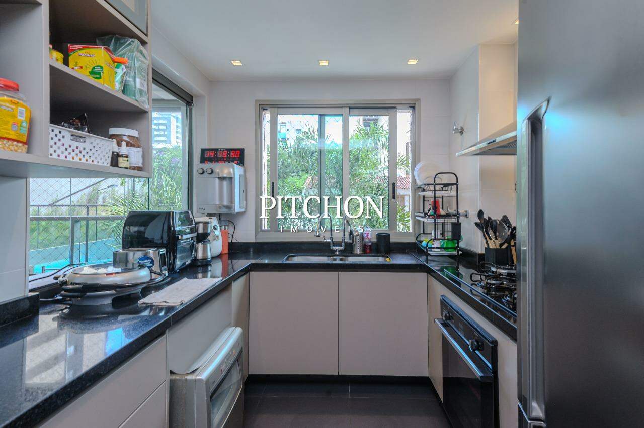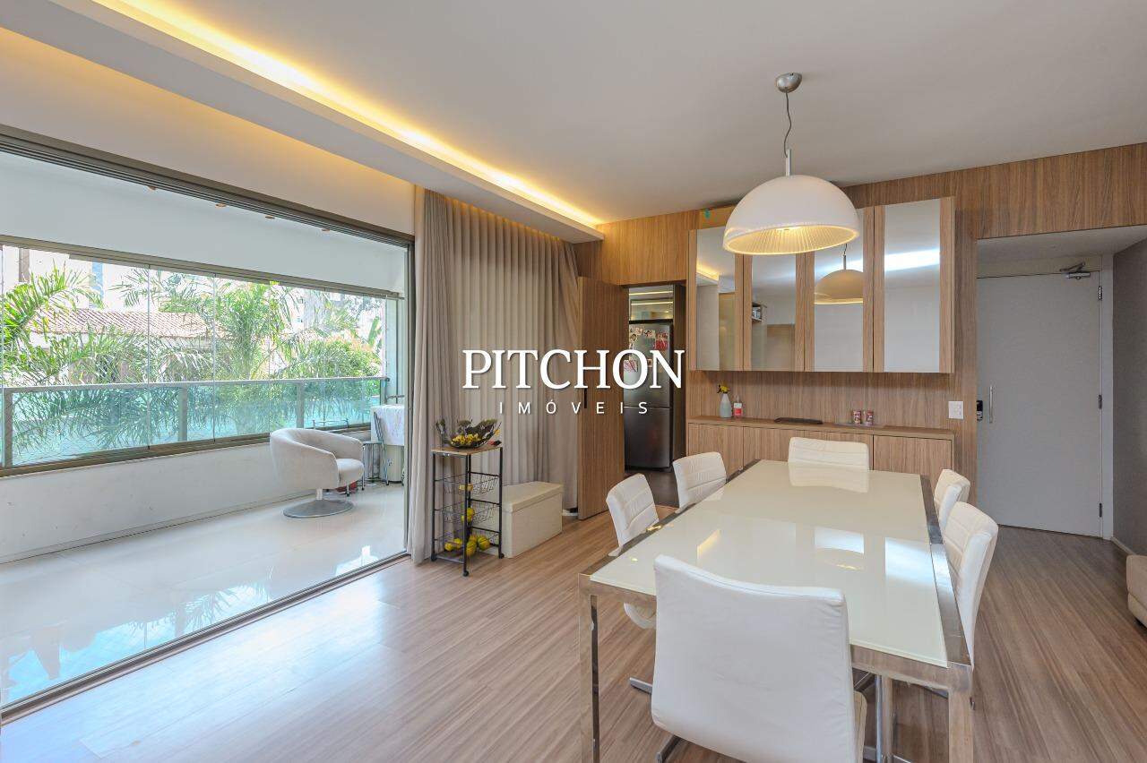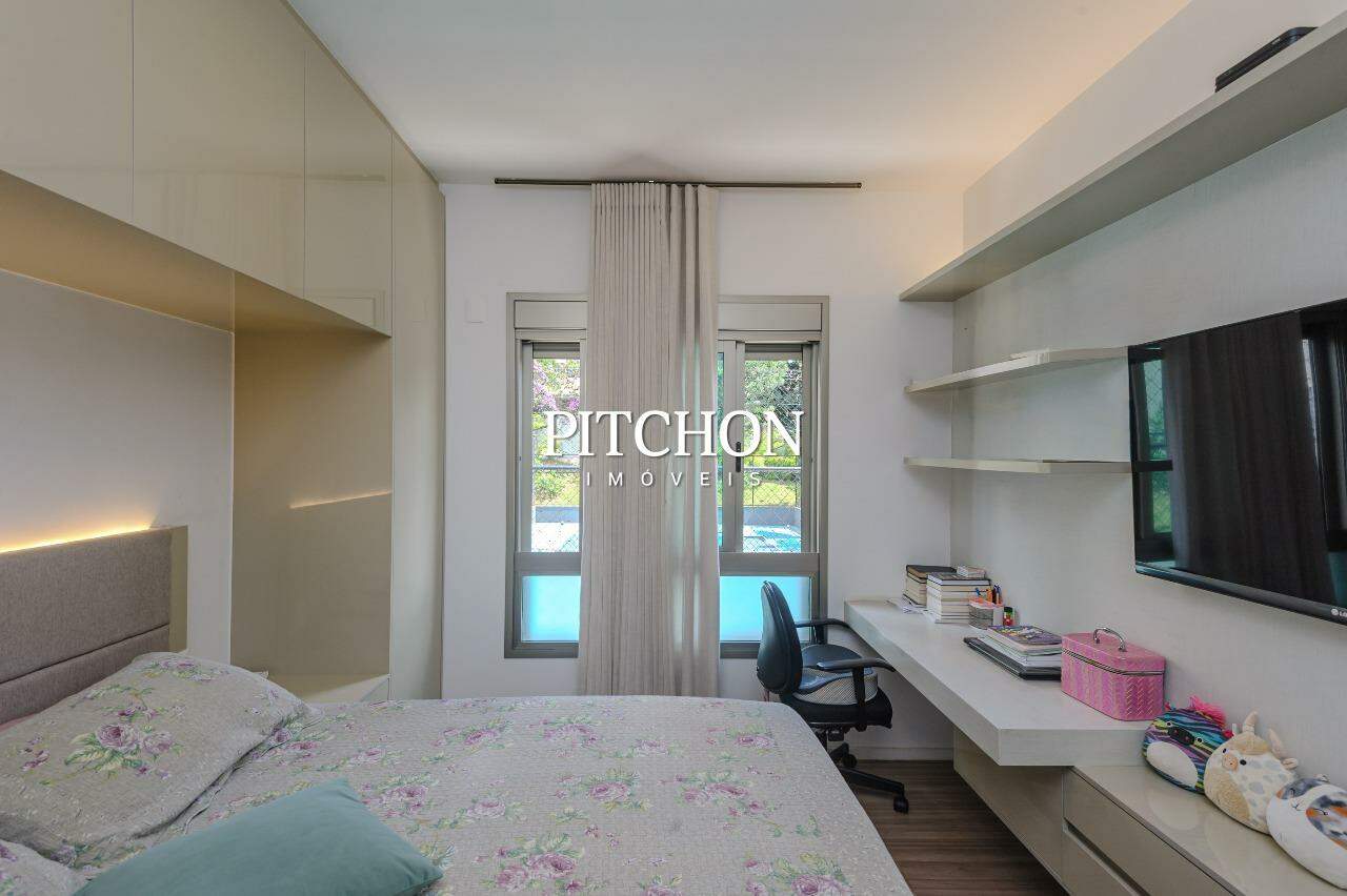 Área íntima com rouparia no corredor e 4 quartos, todos com armários planejados com portas de correr em espelhos e ar condicionado, sendo 2 suítes e 2 semi-suítes. O apartamento ainda conta com 3 vagas de garagem e box de garagem.