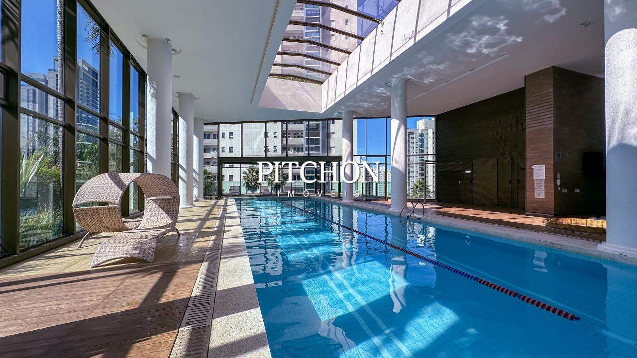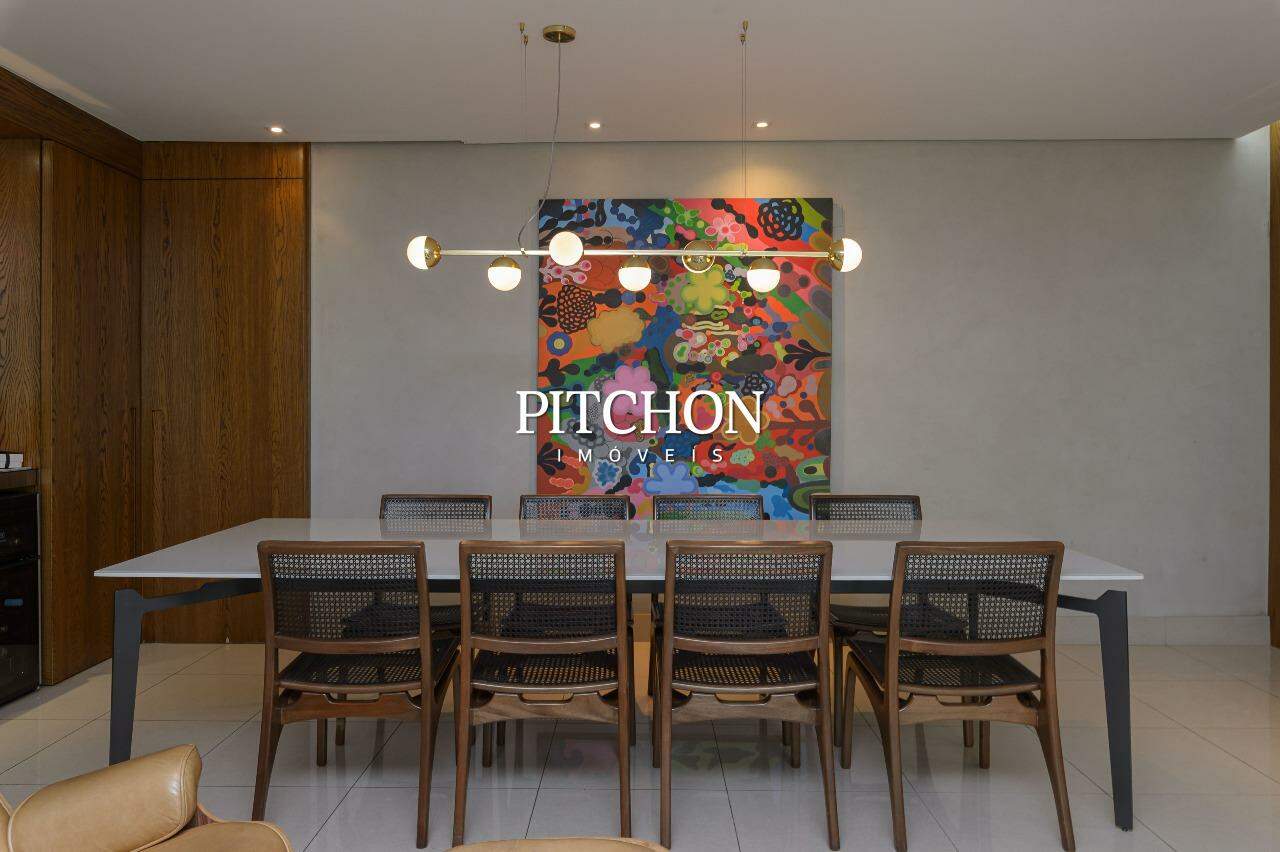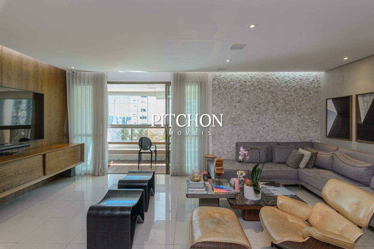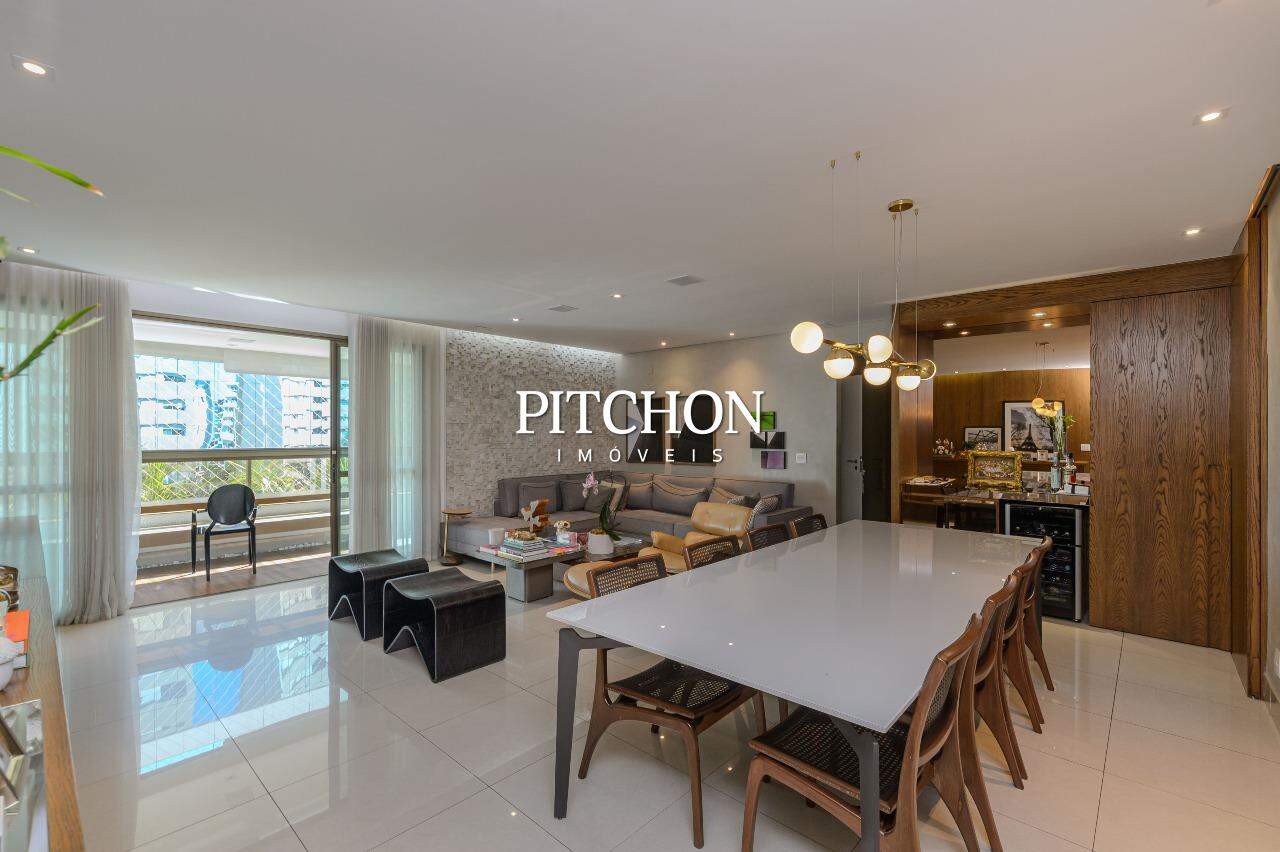A sala ampla para dois ambientes conta com piso em porcelanato, iluminação planejada, espelhos decorativos e painel em madeira, criando um ambiente acolhedor e moderno. A cozinha é funcional e bem equipada, com bancadas em granito, armários planejados e dependência completa de funcionários e ampla área de serviço.