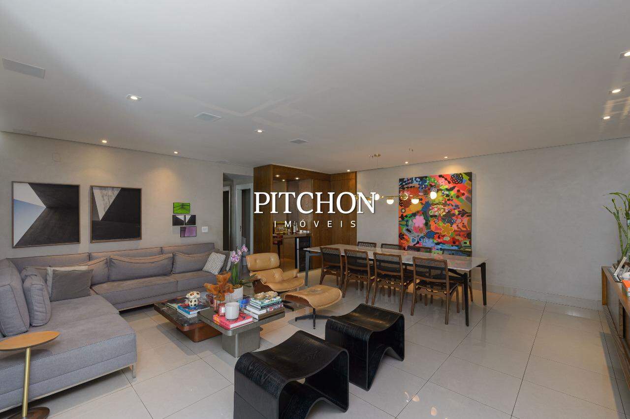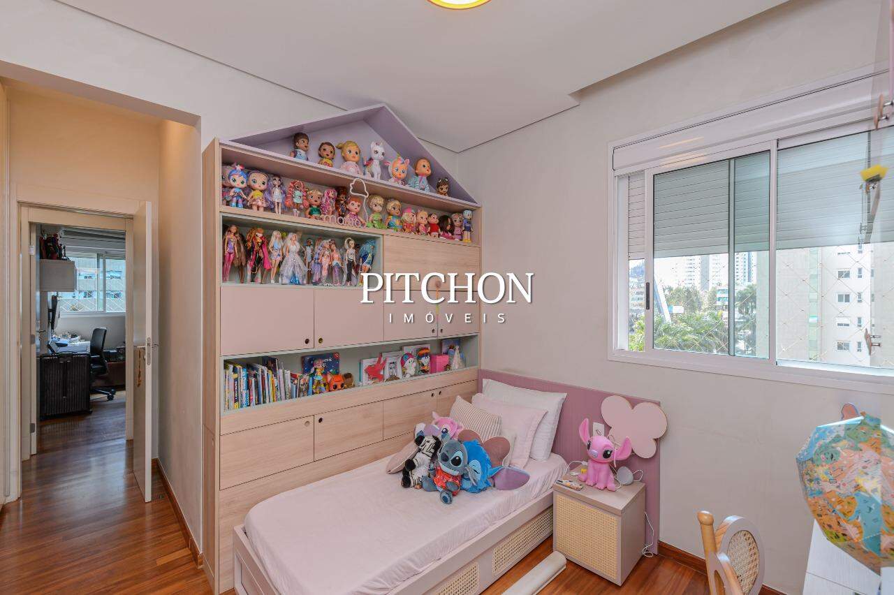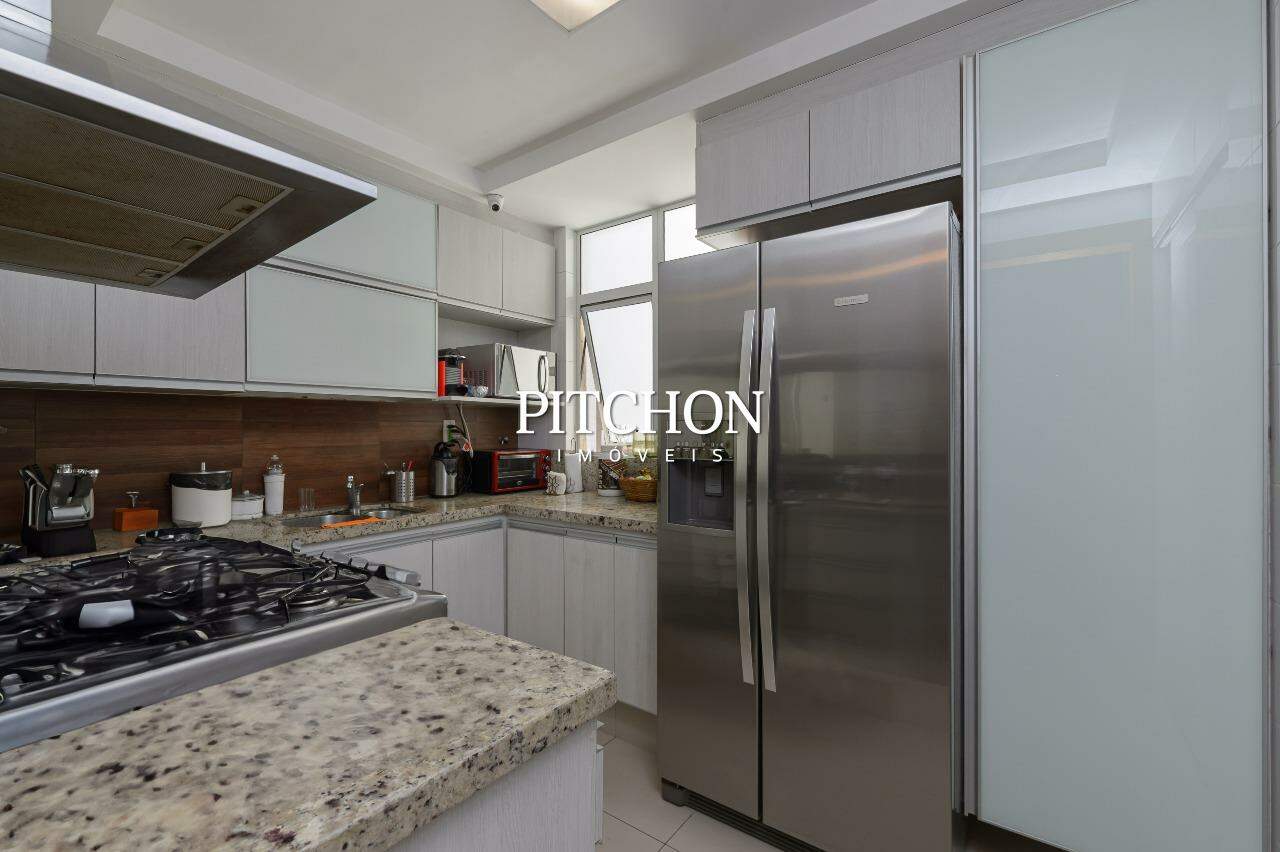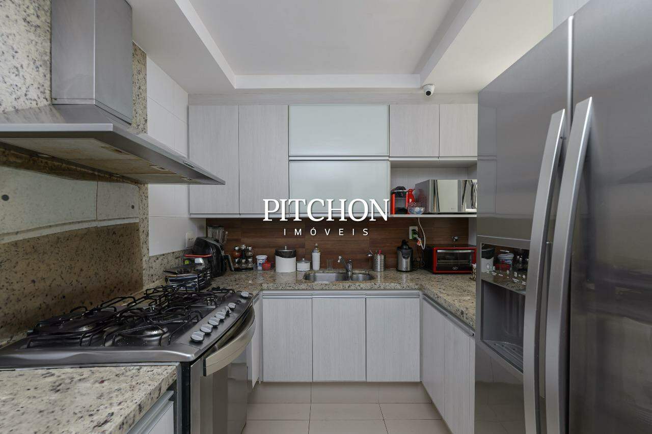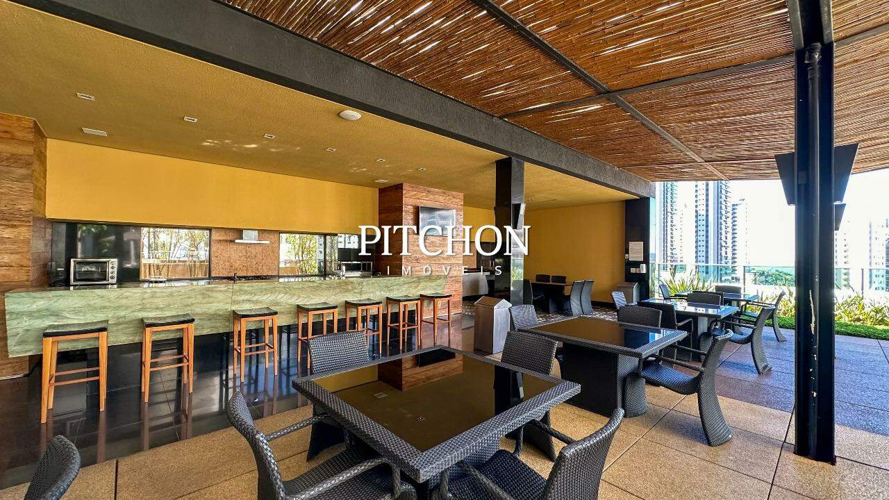 A sala ampla para dois ambientes conta com piso em porcelanato, iluminação planejada, espelhos decorativos e painel em madeira, criando um ambiente acolhedor e moderno. A cozinha é funcional e bem equipada, com bancadas em granito, armários planejados e dependência completa de funcionários e ampla área de serviço.
