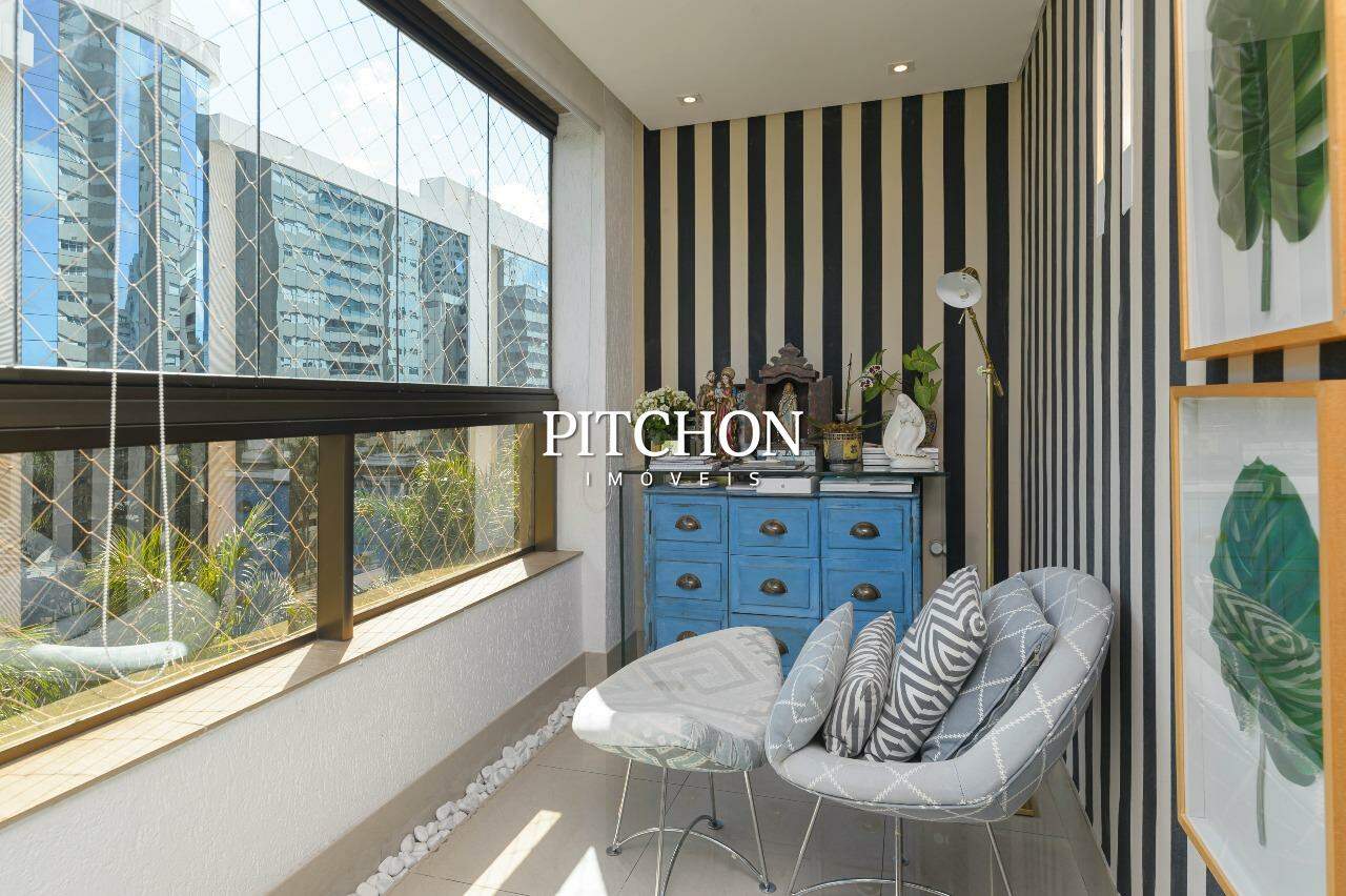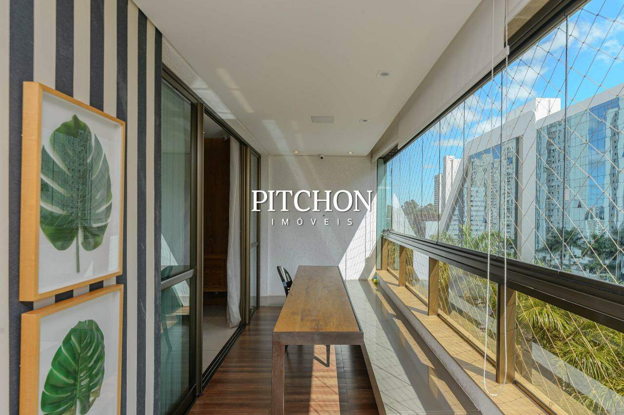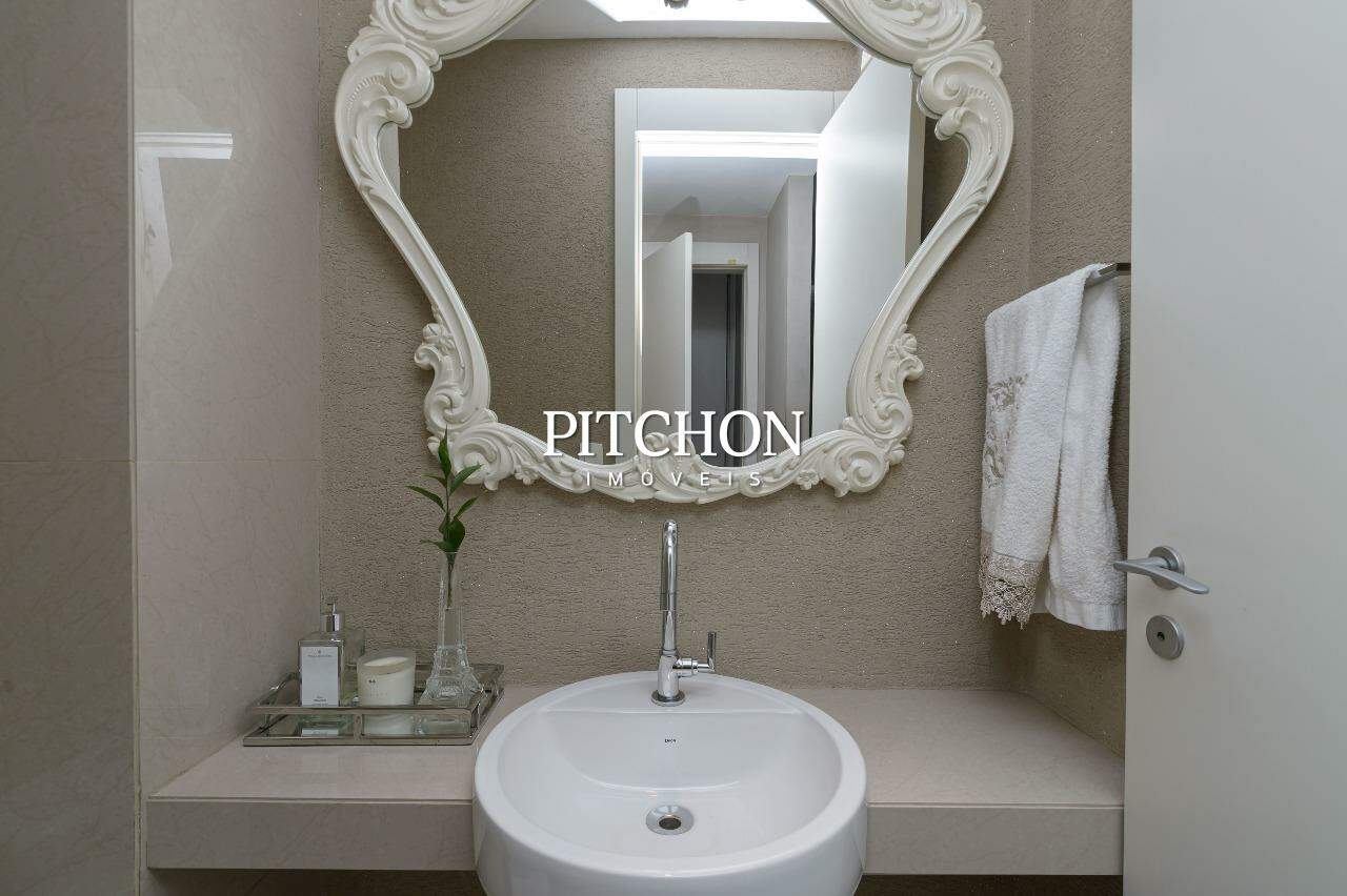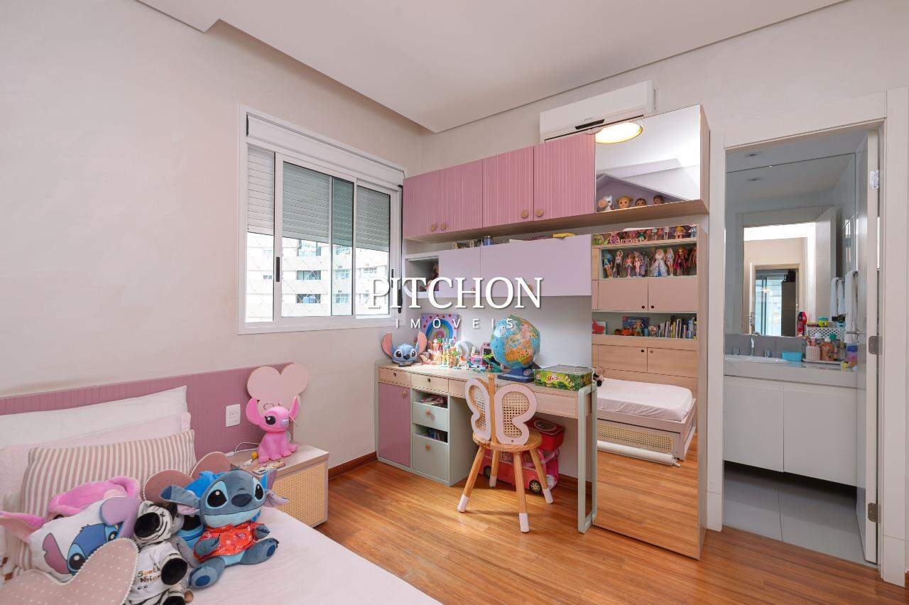A sala ampla para dois ambientes conta com piso em porcelanato, iluminação planejada, espelhos decorativos e painel em madeira, criando um ambiente acolhedor e moderno. A cozinha é funcional e bem equipada, com bancadas em granito, armários planejados e dependência completa de funcionários e ampla área de serviço.
