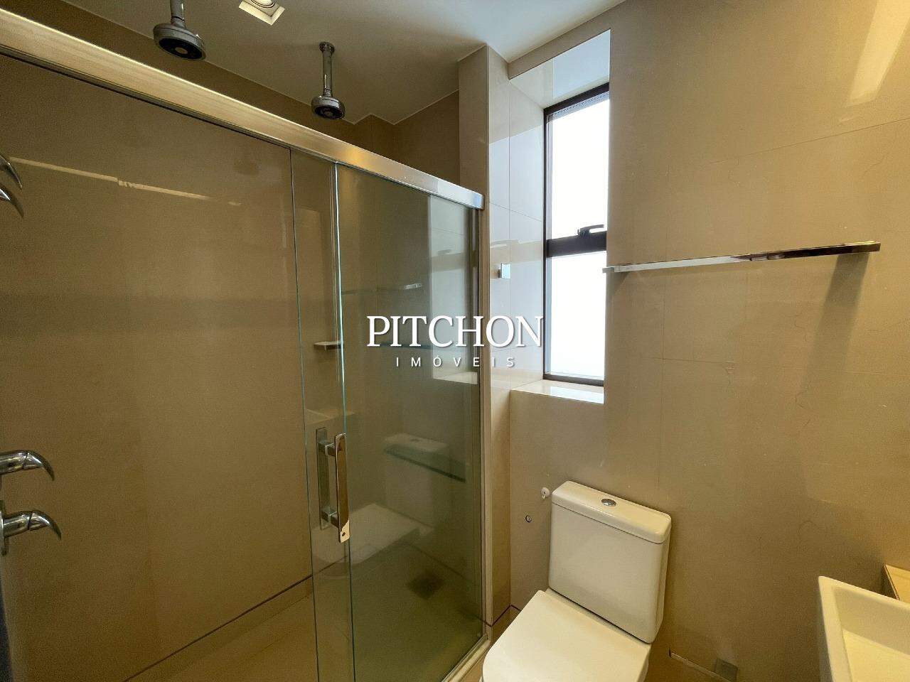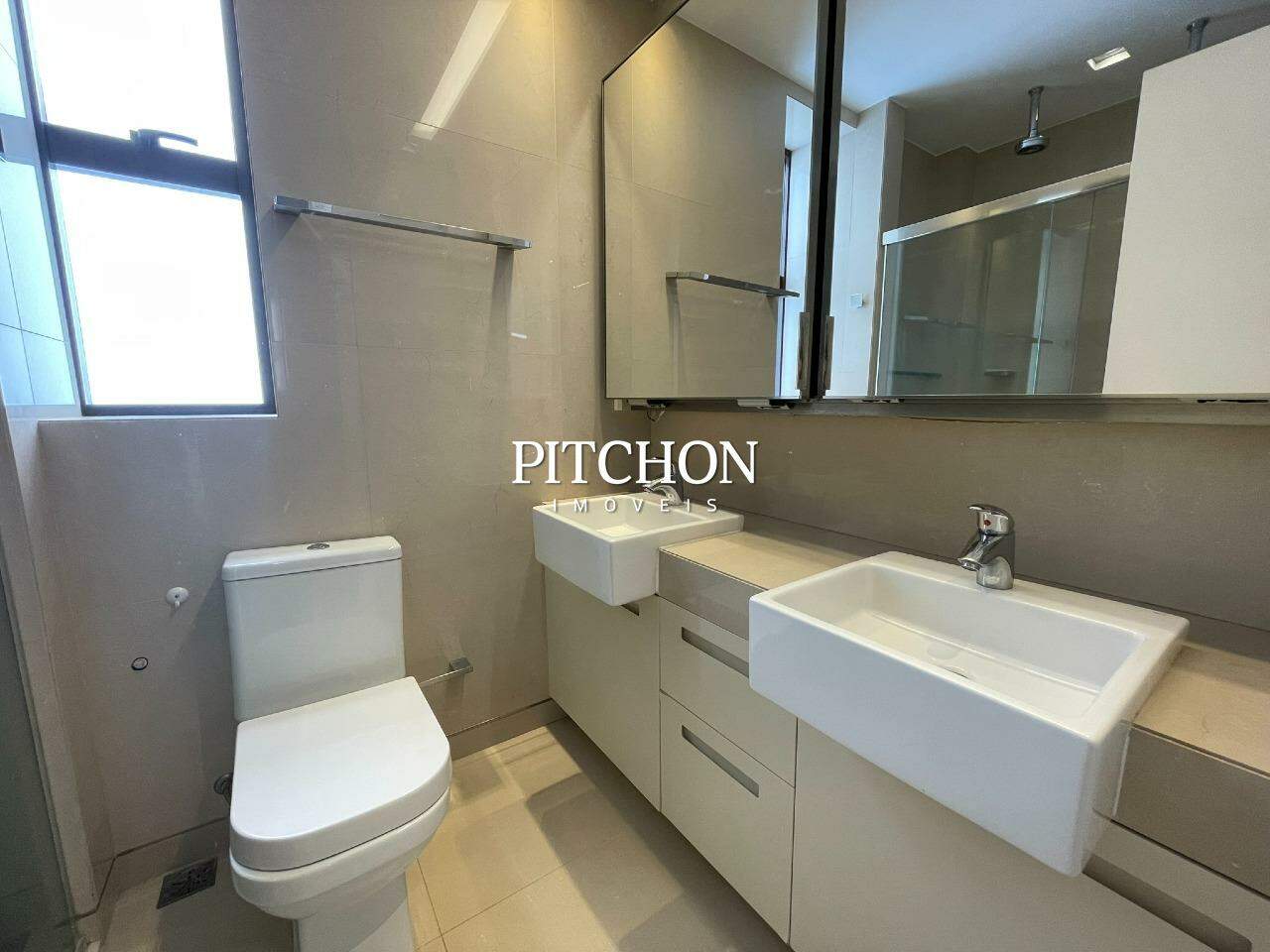 Suíte master com banho amplo, pia dupla e dois chuveiros.