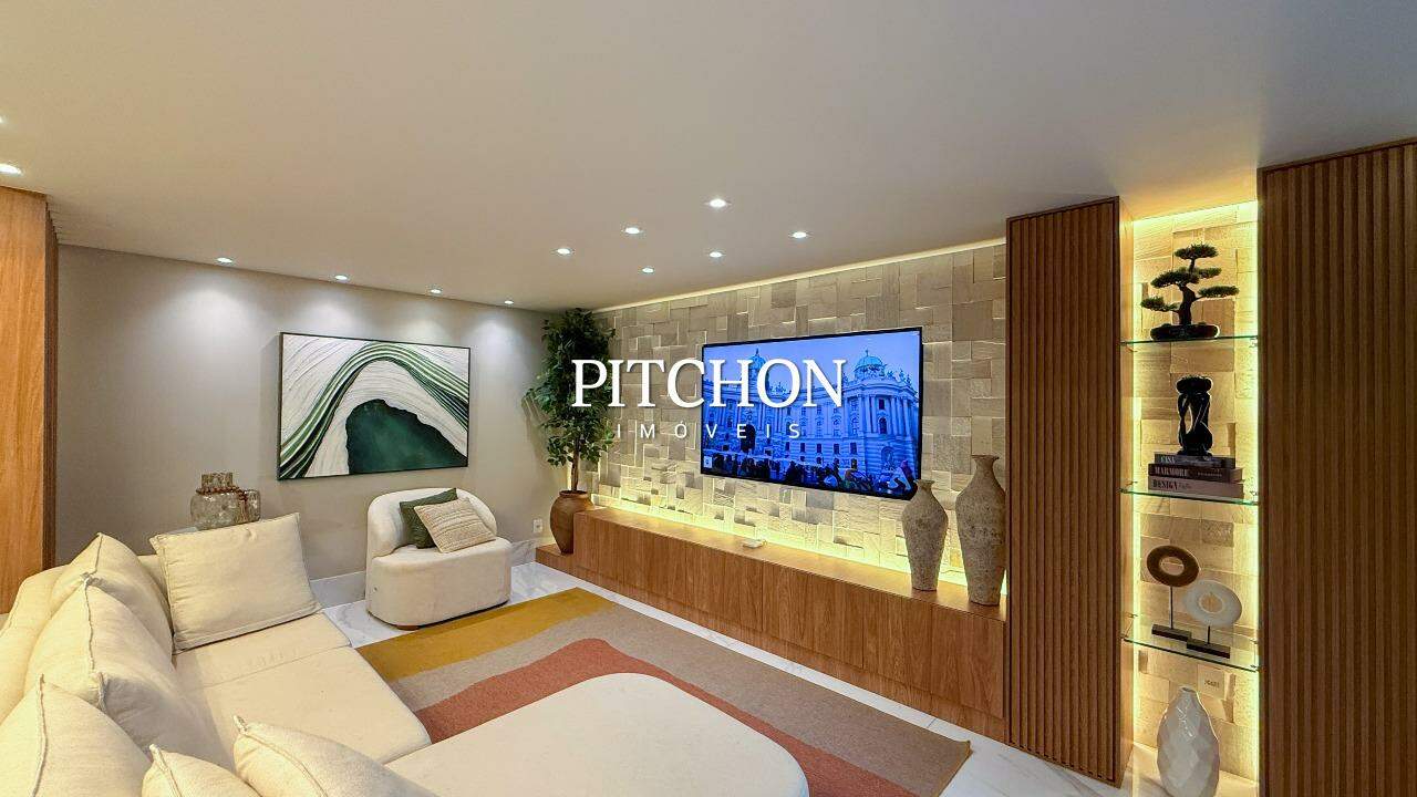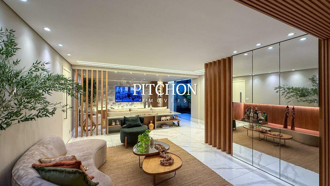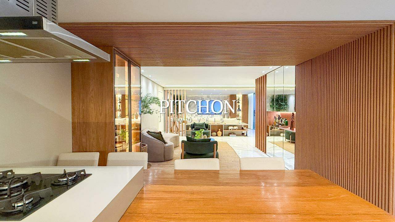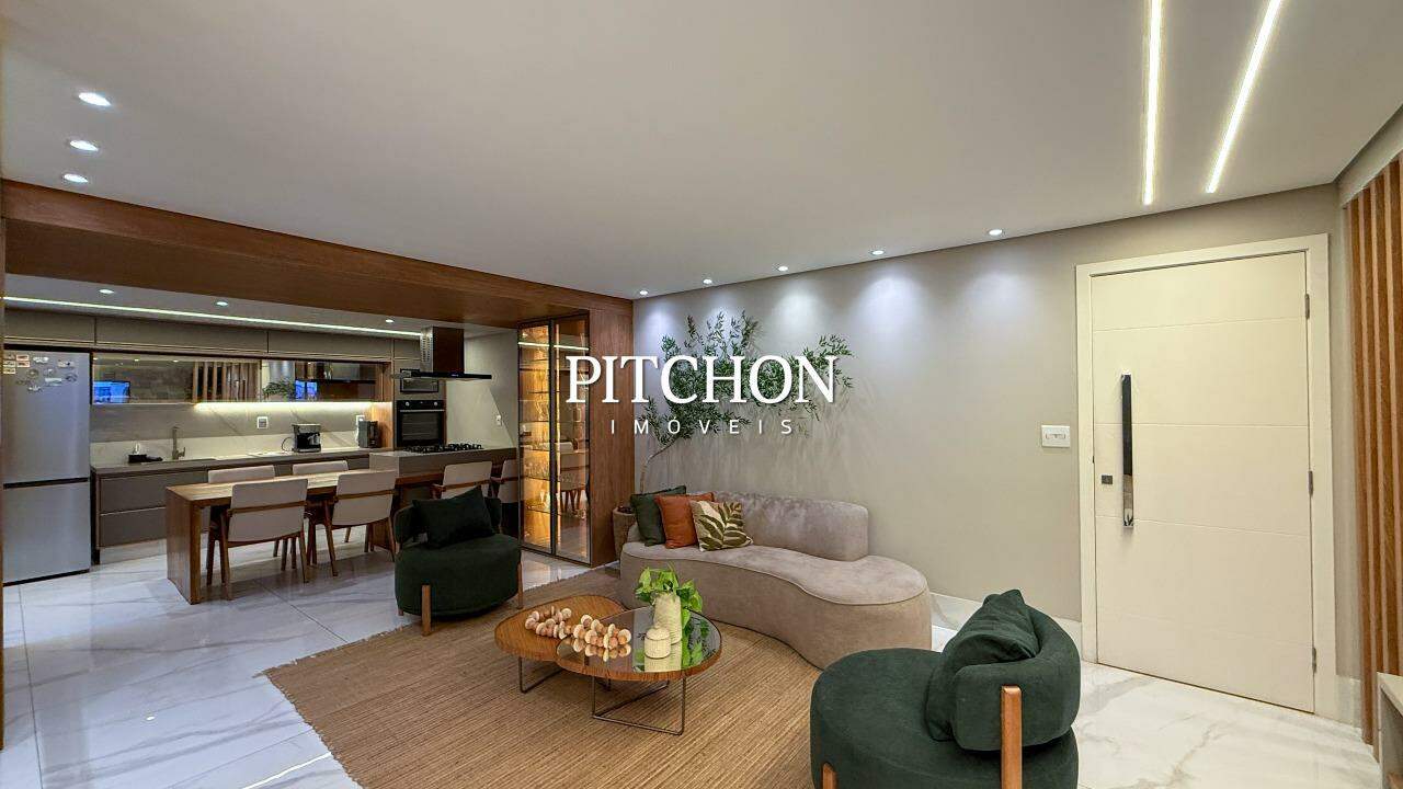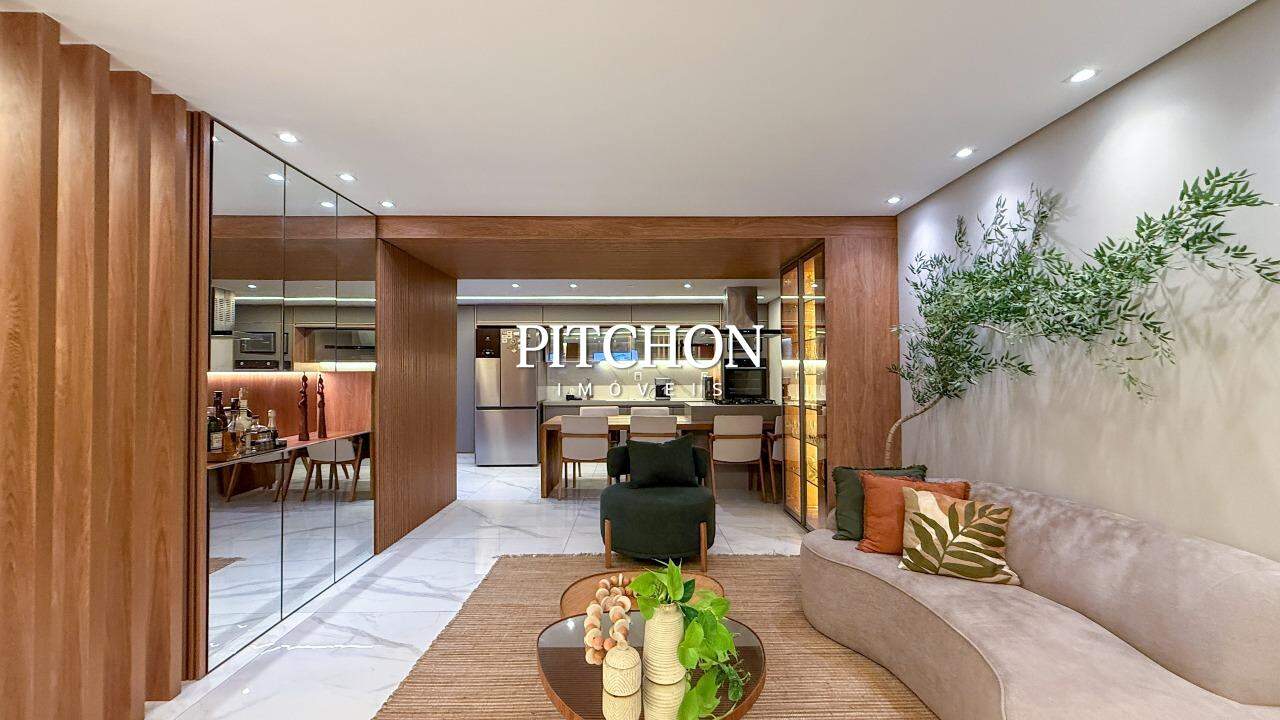 O apartamento possui uma sala extremamente ampla, com dois ambientes integrados e decoração elegante, além de um lavabo moderno e funcional. A cozinha é equipada, prática e se conecta de forma inteligente com a área social.